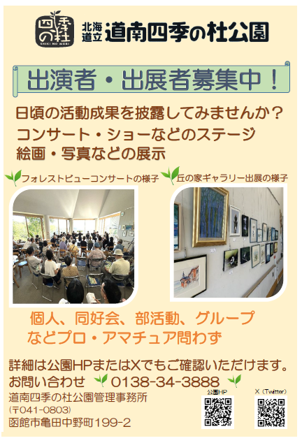 【フォレストビューコンサート・ステージ】【丘の家ギャラリー】では、令和8年度の出演者・出展者を募集しています。
