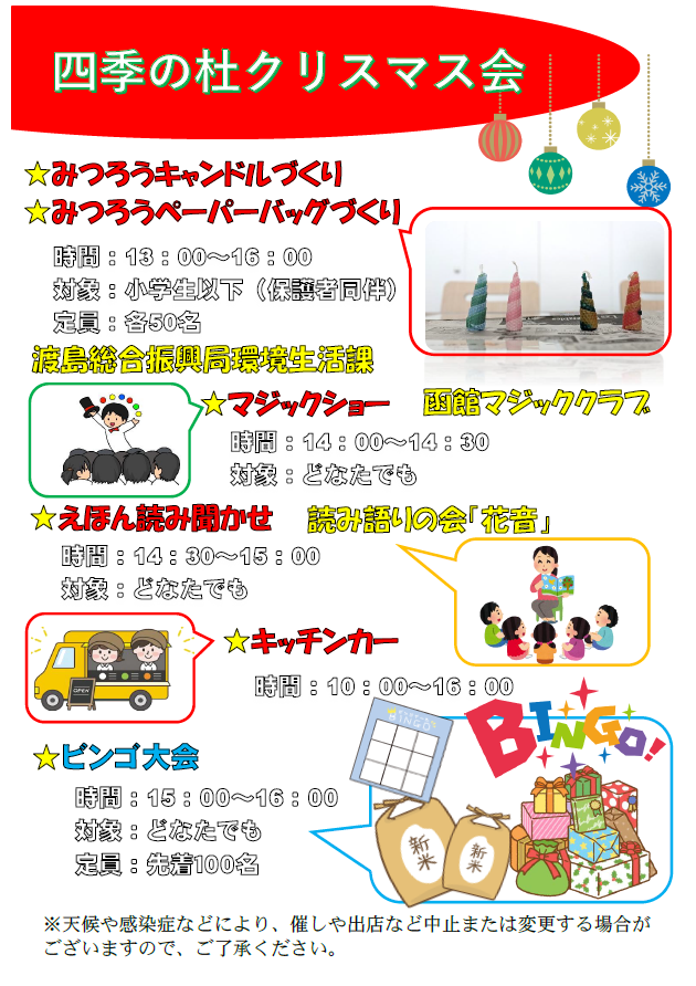 みつろうキャンドルづくり、みつろうペーパーバッグづくり、マジックショー、