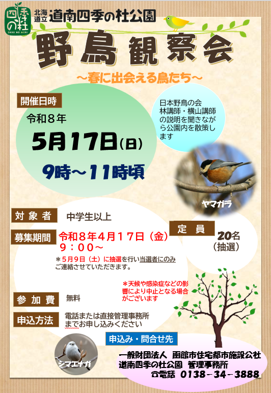 5月17日(日)開催の『野鳥観察会』に参加する方を、